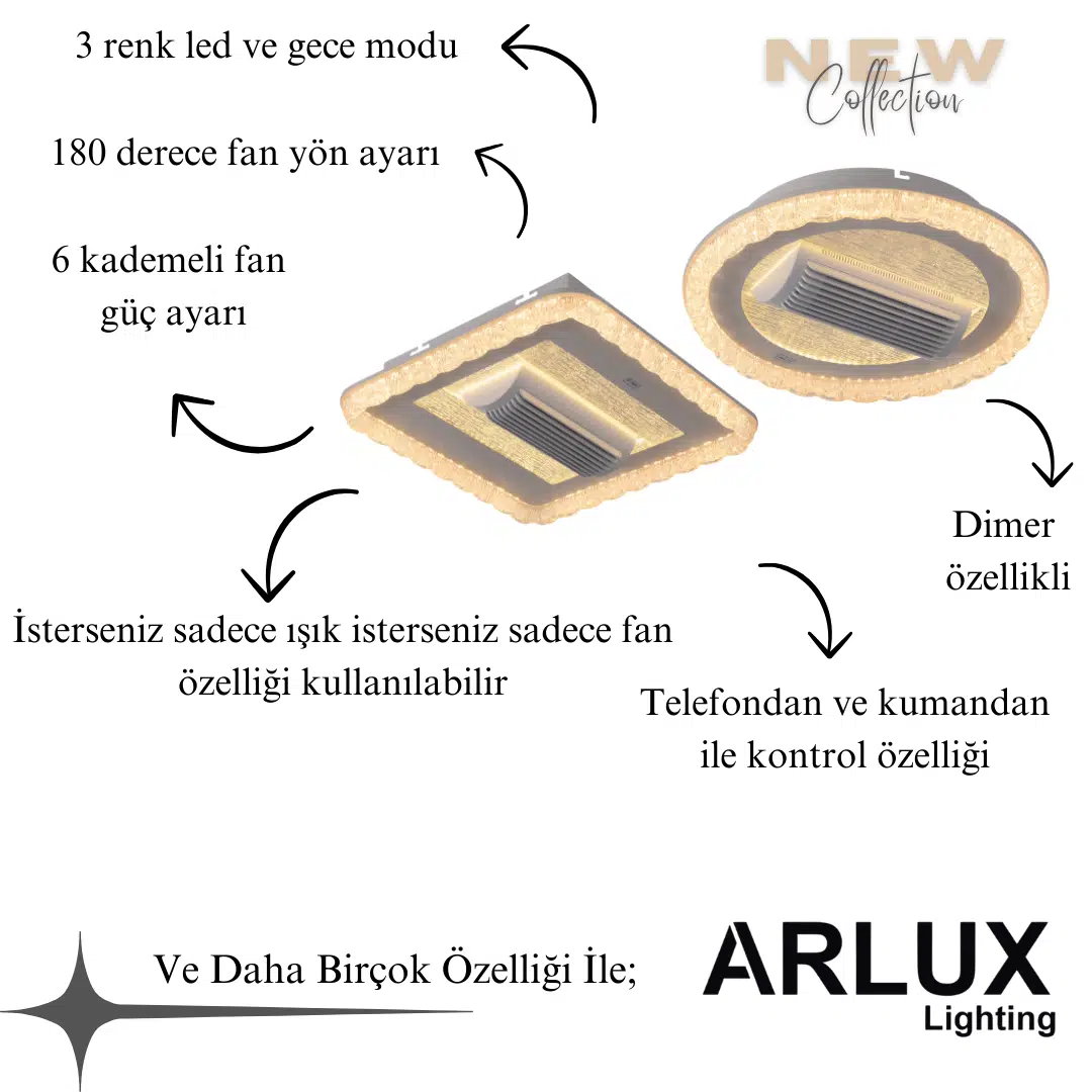 | Etiketler | RANA YUVARLAK 60W LED AVİZE METAL KASA / 3 RENK IŞIK / KUMANDALI FANLI MODEL / |